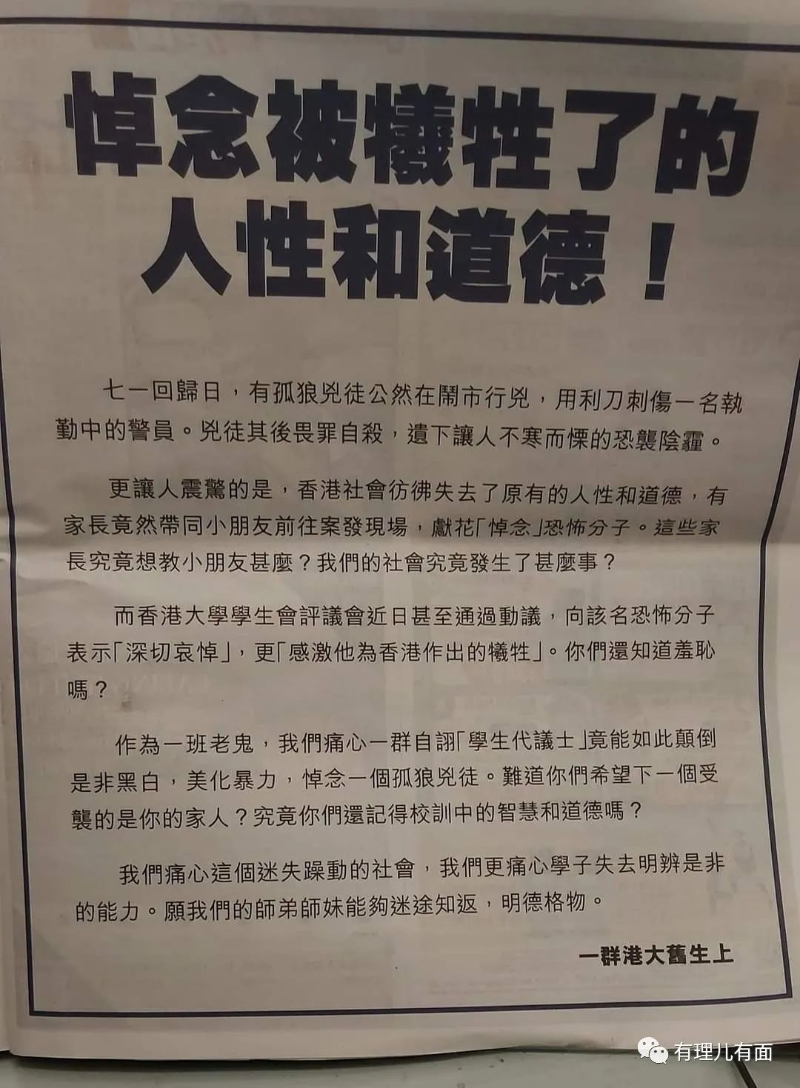 为了不被也当成恐怖分子,港大的旧生登报痛斥学生会的卑鄙。
