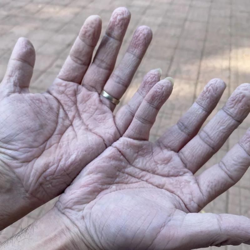 环境消杀、垃圾清运……当工作人员摘掉长时间佩戴的医用手套,被汗水浸渍的双手发白起皱,他们眉头微皱后会心一笑,相互鼓励:“脸上的印痕,发白的双手,都是我战斗的痕迹!”