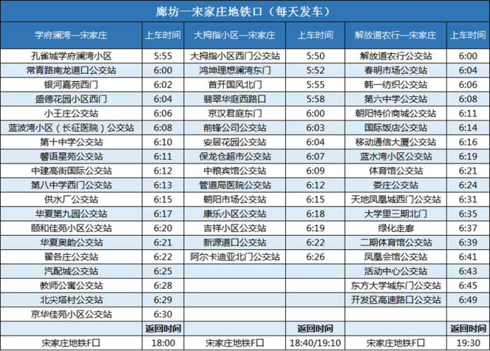 北京宋家庄返回时间调整为18:40,增加19:10返回大拇指小区班次。