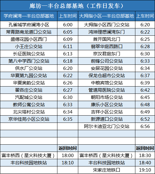 丰台总部基地取消中核路口东和海鹰路口2个站点,富丰桥西发车时间调整为18:00,同时对廊坊城区停靠站点进行优化。