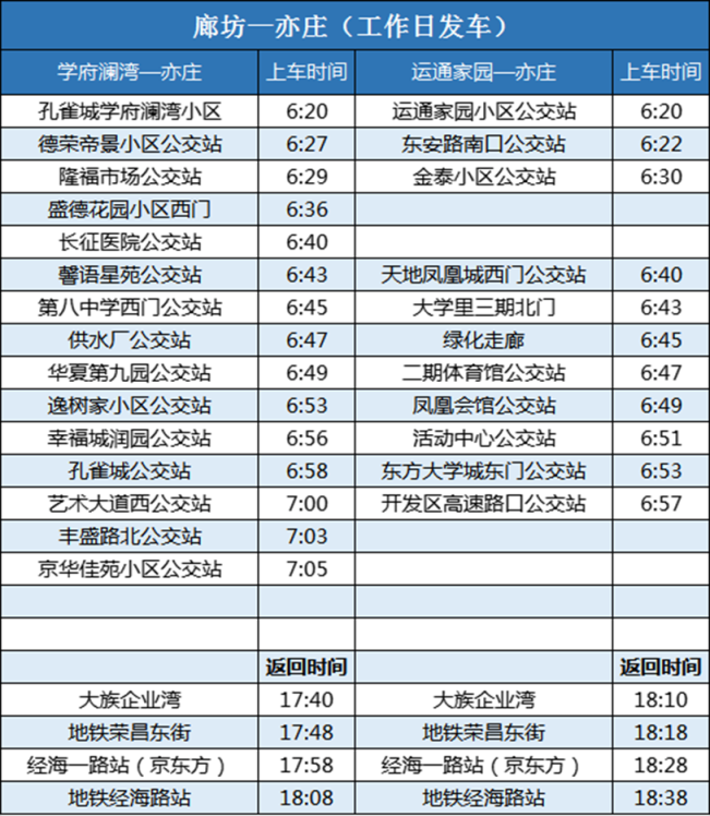 廊坊学府澜湾小区始发时间调整为6:20,亦庄大族企业湾始发时间调整为17:40;廊坊城区运行线路进行了优化调整。
