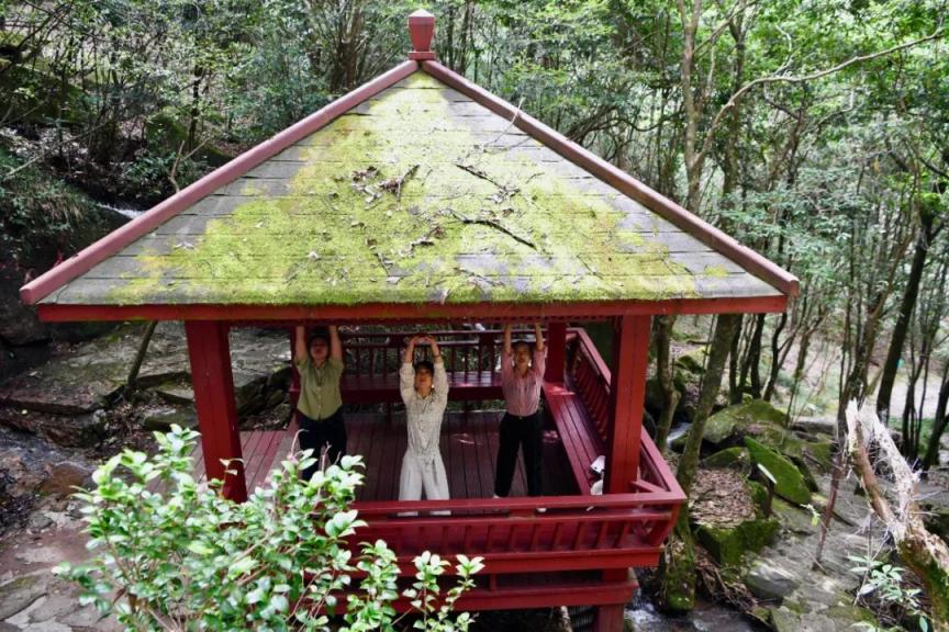 2022年7月16日,几名女士在福建省泉州市德化县九仙山森林康养基地做养生操。姜克红 摄