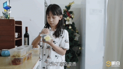 早上7点,剩菜在室温环境里存放了11个小时,一涵一家查看了放在饭盒里的食物,闻了闻气味。