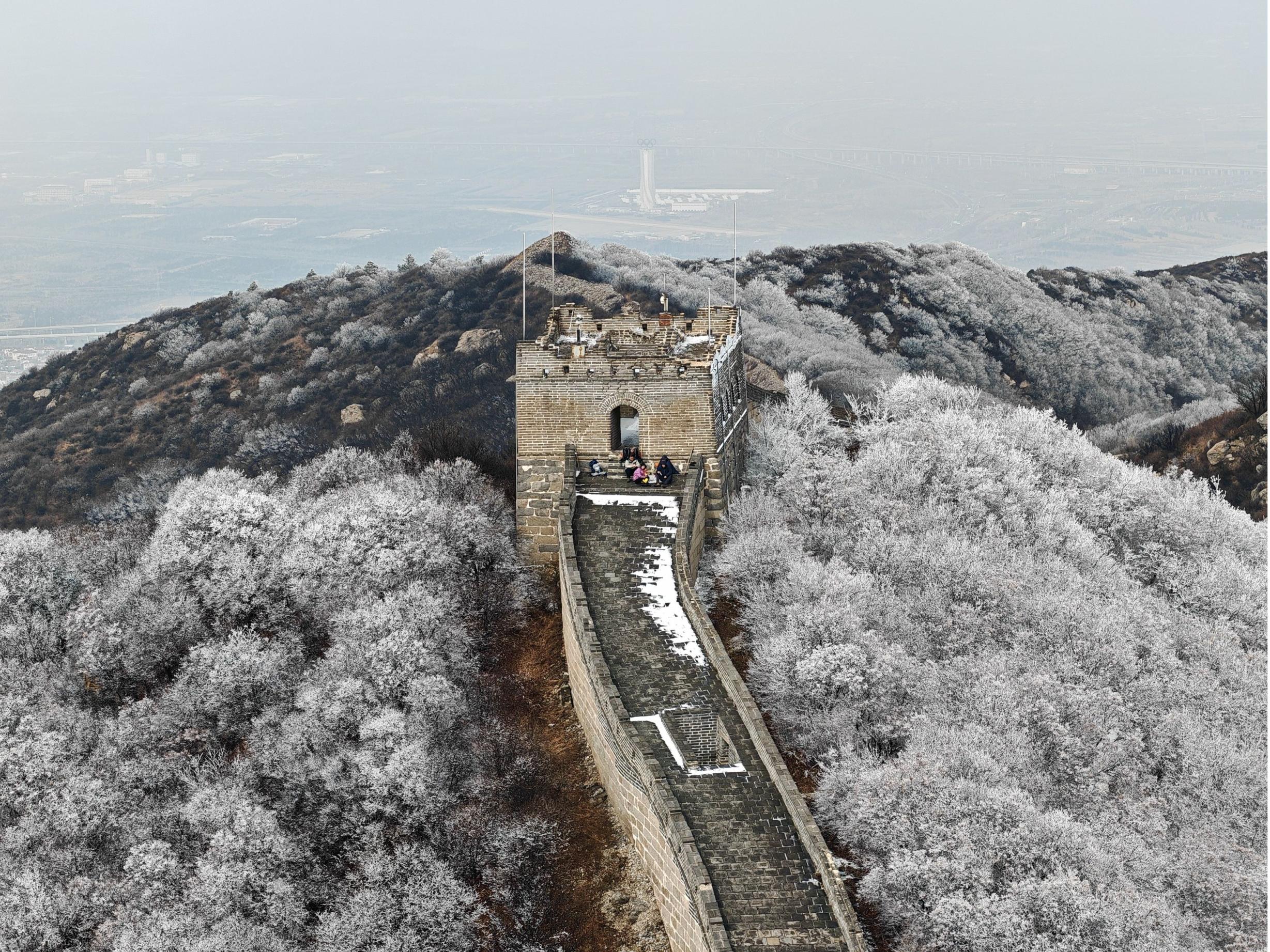 3月2日,八达岭古长城出现雾凇美景,宛如一幅水墨画卷。晶莹剔透的冰凌挂满树枝,与城墙交相辉映,让古长城愈显壮美,吸引人们游览拍照。