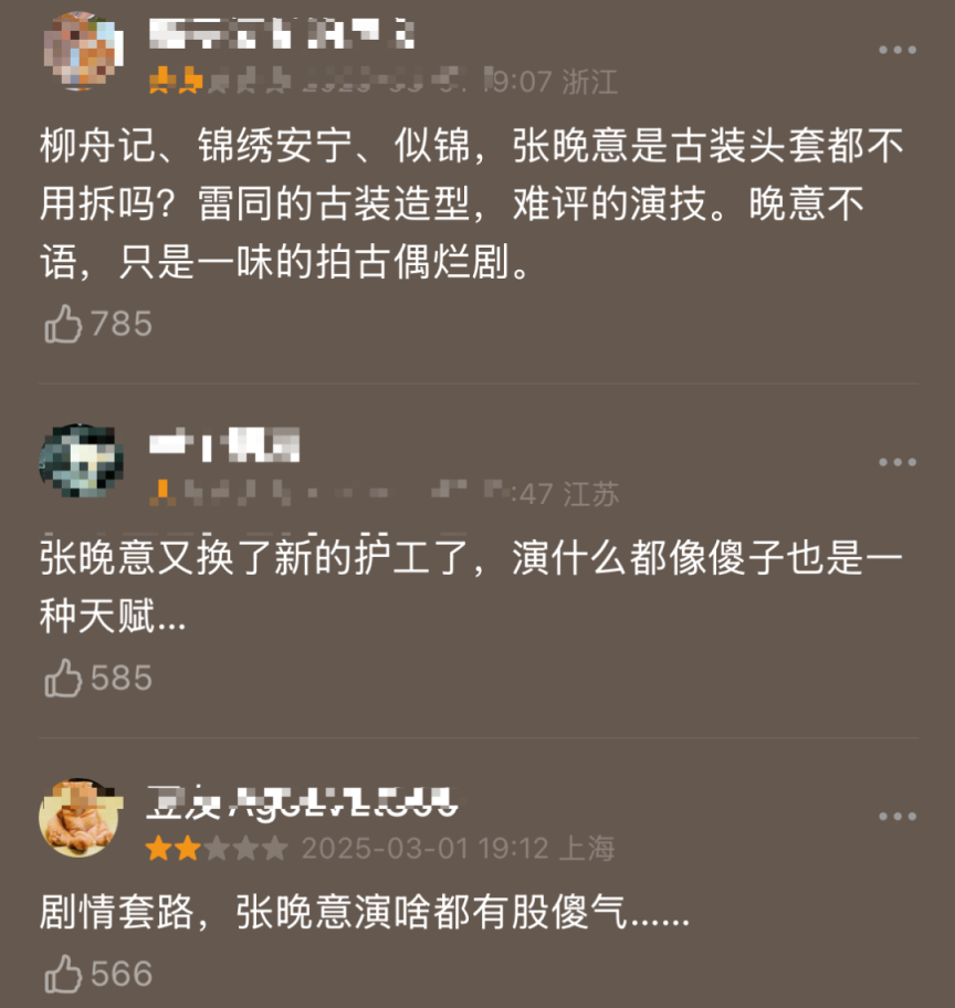 张晚意为《似锦》承接了第一轮炮火倒也不算冤枉,这剧和他上一部《锦绣安宁》太同质化了。