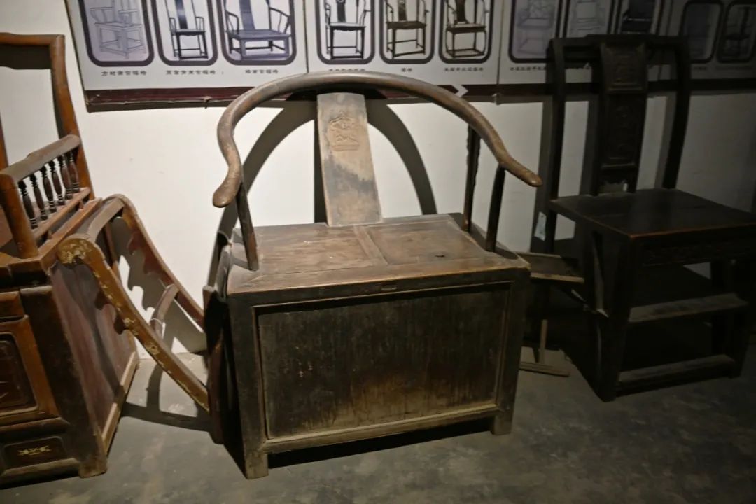 展厅中有两把椅子很像,它们的上半部像圈椅,而下面则是一只箱子,“别看两把椅子长得一样,但是用途完全不同。”