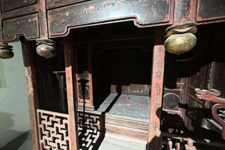 王文旺收藏的木床很多,他最喜欢一张漆满红色的古代婚床。这张木床十分复杂,乍一看像是一间微缩版的卧室,不仅主人躺卧的地方是一个独立的空间,这个空间外面还有一个很小的平台,像是四合院门口的门厅。这张床的四周也是雕梁画栋,雕刻着鸟、鲜花、云彩等吉祥纹路,床一侧的板子也能开合,就像窗子。