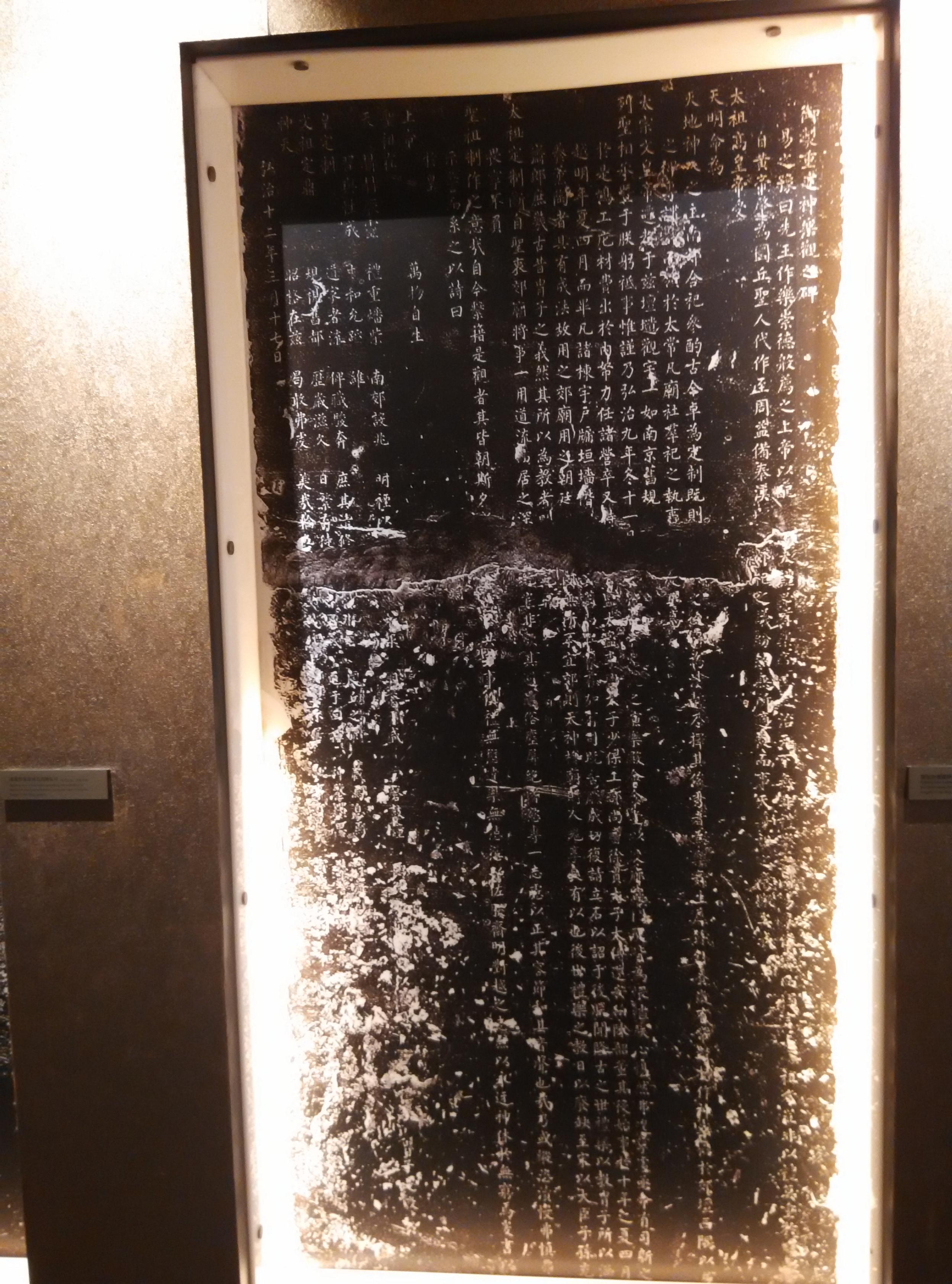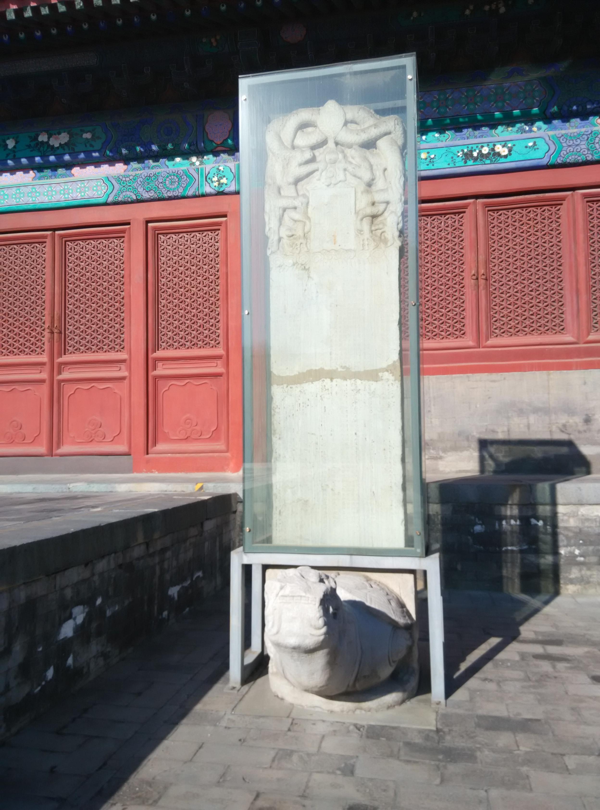 辛丑(2021年)春,读了《大家小书》语言文化卷中,施蛰存著《金石丛话》,兴致使然到神乐署读识里面的六座碑石。“重建神乐观之碑”坐落在凝禧殿丹墀左侧,其尺寸、石质、雕饰《天坛志》记载无误。但首题及篆额均为“御制重建神乐观之碑”。据明孝宗实录记载:“弘治十年三月丙午,监察御史熊达以神乐观失火,烧毁库舍、器服,劾太常寺卿崔志端奸邪诙谐,纵容道流饮博歌呼,亵渎所致。虽尝罚俸,尚未明正其罪,乞禠其职名,代以端人,以重郊祀。”因神乐观失火,故而重建。其役始于弘治十年,太监李兴、太子少保工部尚书徐贯,太子太傅遂安伯陈韶董其役。重建费用按碑文“费出于内帑”。此碑史料价值极高,且大部分碑文可读识。天坛公园的巨幅拓片也比较清晰。
