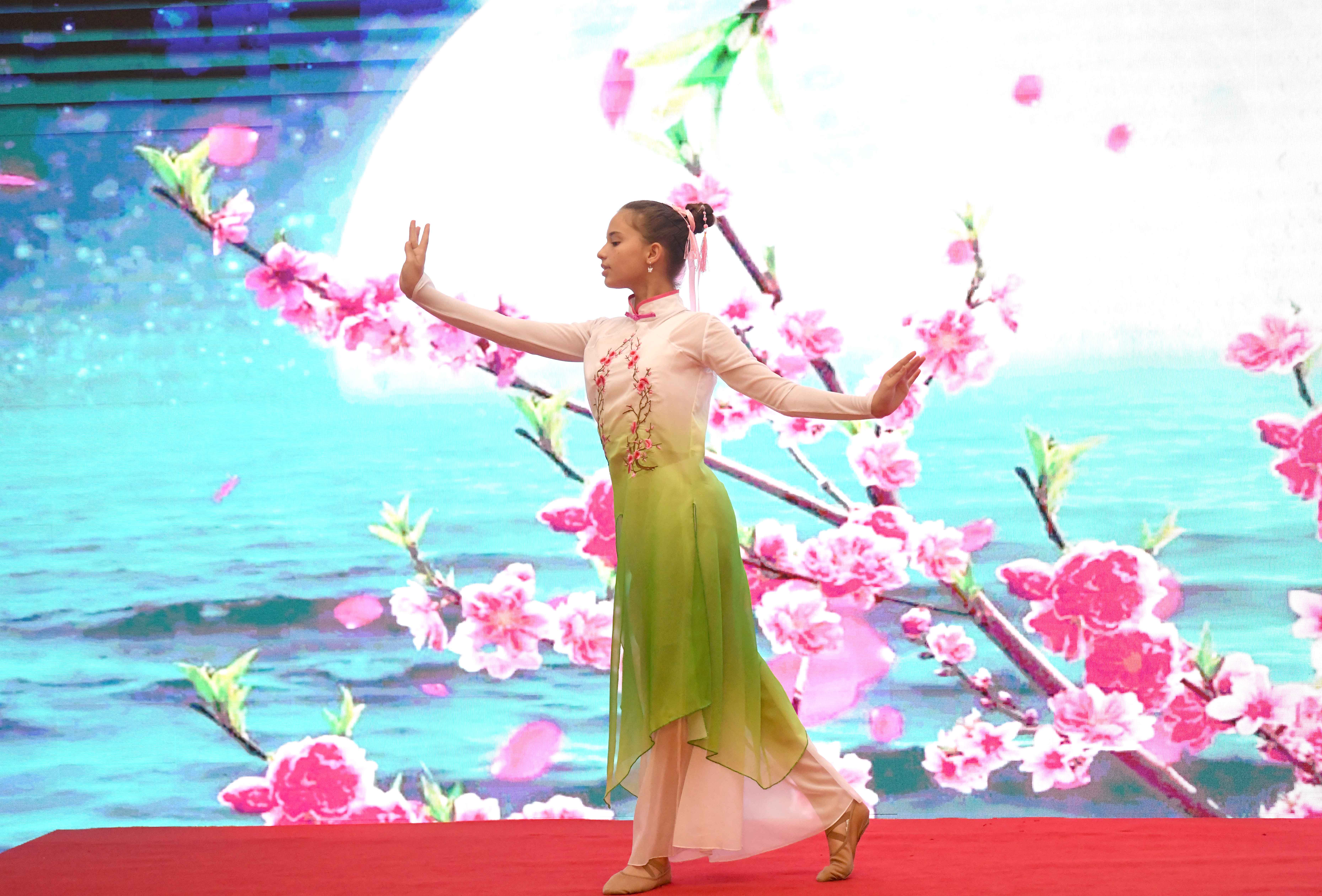 来自乌克兰的柏丽娜身着中国传统服饰翩翩起舞,精湛演绎萨顶顶的《左手指月》。