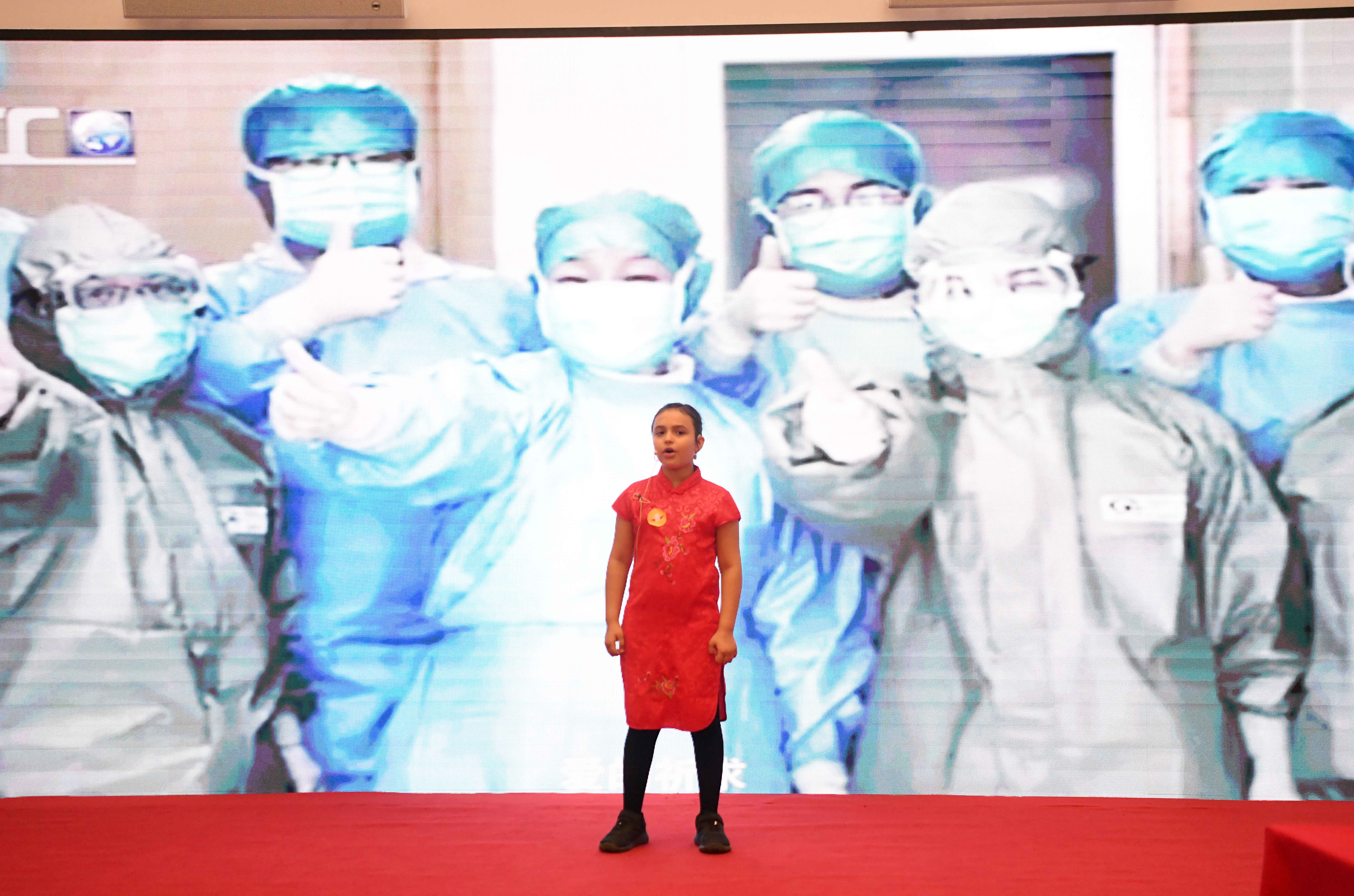 “疫情来临正是生命最顽强的时候,生命要靠信念来坚守……”当8岁的伊朗小女孩白雪用标准的普通话唱出歌曲《手拉手 战疫情》,台下她的母亲白玫的眼眶湿润了。