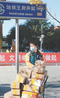在王府井食品商场鳞次栉比的商户中间,谭海波拉着一辆折叠平板车,逐个铺位“扫货”——将商户们封好的包裹整齐地码放装车。不到30分钟,他已经揽收了50多件包裹,这些包裹有的是游客们来京旅游的纪念品,有的是网友们“双11”疯狂购物的“战利品”。在接下来的几小时中,它们将跟随王府井营业部的邮车运往全国。