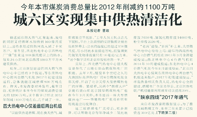 到2015年时,北京规划建设的四大燃气热电中心已经有3个投入运营。与此同时,北京已完成12616蒸吨采暖燃煤锅炉改造,城六区基本实现无燃煤锅炉;全市累计改造工业锅炉3307蒸吨,市级以上工业园区基本实现生产用能清洁化;东西城近8万户平房居民“煤改电”,农村和城乡结合部则通过“煤改电”“煤改气”削减民用散煤7.8万吨……城六区基本实现集中供热清洁化。(2015年12月31日《北京日报》1版,《城六区实现集中供热清洁化》)