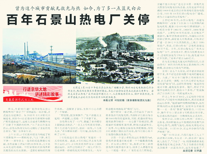 此后多年,石景山热电厂为北京集中供热做出了重要贡献。随着京城环保要求的不断提高,2015年3月19日,石景山热电厂烧尽了厂里的最后一块存煤,正式退出历史舞台。