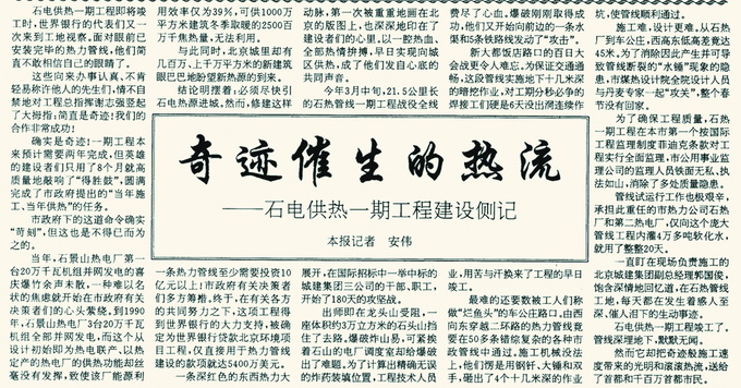1992年11月,石景山热电厂供热一期工程——21.5公里管线即将竣工时,世界银行的代表们到工地视察。面对眼前已安装完毕的热力管线,他们简直不敢相信自己的眼睛。因为一期工程本来计划两年完成,但建设者们只用了8个月就圆满完成了北京市政府提出的“当年施工、当年供热”的任务。这奇迹般的施工速度为首都千百万市民带去了滚滚热流。(1992年11月22日《北京日报》1版,《奇迹催生的热流》)