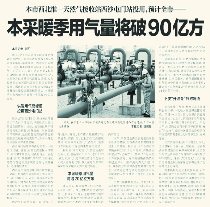 近年来,全市清洁能源供热比例进一步提高。据本报2014年11月28日6版《本采暖季用气量将破90亿方》报道,当年全市供热总面积达到7.5亿平方米,其中,5.5亿平方米为居民住宅。城市热力集中供热都被燃气替代,全市清洁能源供热面积达到80%。