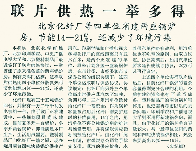 1984年,北京化学纤维厂、北京印刷学院、中央广播电视大学和北京塑料制品厂签订了联片供热协议。按照协议规定:北京化学纤维厂向另外三个单位每小时供应蒸汽20吨至25吨,为期15年。三个用汽单位拨付给化纤厂一笔资金,作为锅炉容量被占用后化纤厂需要扩建时的补偿费用。15年之内,用汽单位不再分摊锅炉房的扩建与维修费用,并将煤炭供应指标划拨给化纤厂,由化纤厂统一申请,市煤炭总公司给予优先安排。这四个单位实行联片供热后,北京塑料制品厂的两台锅炉停用,北京印刷学院和中央广播电视大学则不用再新建锅炉房。更重要的是,这样联片供热比四个单位分散供热节约能源14%至21%,还减少了环境污染。(1984年12月17日《北京日报》1版,《联片供热一举多得》)