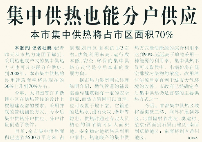2001年,本市集中供热面积达到5500万平方米,占到规划市区面积的三分之一左右。从那一年起,北京集中供热的住宅全面实行分户计量设计,之前建成的集中供热住宅小区陆续进行改造,增设分户截门和计量管线。当年新建的太阳园小区在供热管线设计上采用了并联的管线铺设方式,为集中供热分户供应、分户计量创造条件。(2001年10月23日《北京日报》8版,《集中供热也能分户供应》)