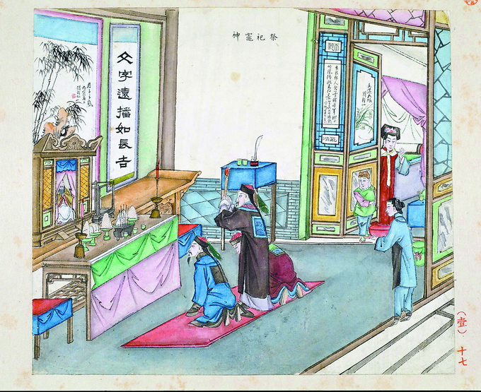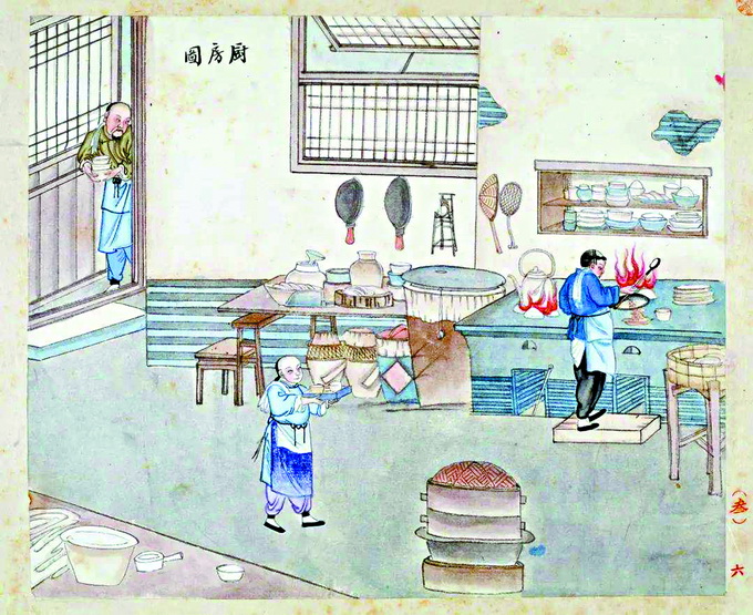 旧时厨房,灶的墙壁上方设有神坛,用于祭祀灶神。图自《北京风俗图谱》一书
