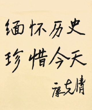当我们学习和了解新中国的革命历史,就不会忘记革命先辈们的教导和嘱托,不能忘记她们曾经的浴血奋战。蔡畅的哥哥蔡和森,与毛泽东主席友谊深厚,他们在长沙组织成立了新民学会,蔡畅题词(图6)记录并回忆了当年的革命岁月,笔迹流利酣畅。邓颖超题词(图7)讴歌了大好河山,字形很见力道。王光美题词(图8)赞美了“今日人间”,气息秀美雅致。今天美好的一切,都离不开革命先辈们的艰苦奋斗和不懈斗争。她们不仅是为了自身的解放,更是为了民族的解放。今天的胜利和幸福,来之不易,就像康克清所题写的——“缅怀历史,珍惜今天”(图9)。无时无刻不提醒我们,不忘初心,牢记使命。