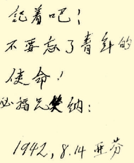 刘惜芬 记着吧!不要忘了青年的使命!必福兄笑纳。1942.8.14亚芬。(图4)