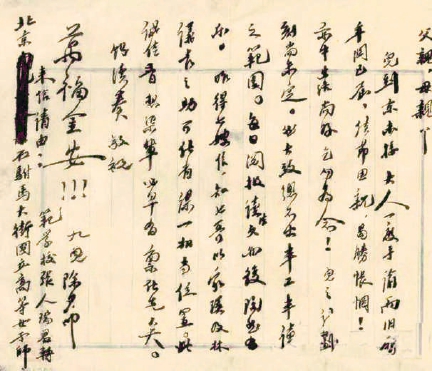 向警予 1919年给家人的信:父亲,母亲,儿到京未接大人一度手谕,而旧历年关已届,佳节思亲,曷胜怅惘!京中生活尚好,乞勿为念!儿之计划刻尚未定,然大致总不出半工半读之范围,每日阅报读法文,亦复陶然有乐。昨得七嫂信,知七哥以家瑛及林议长之助,可化省课一相当位置。此诚佳音,想渠辈必早有禀在先矣。余续奏。敬祝万福金安!!!九儿除夕叩。来信请邮(由):北京石驸马大街国立高等女子师范学校张人瑞君转。(图5)