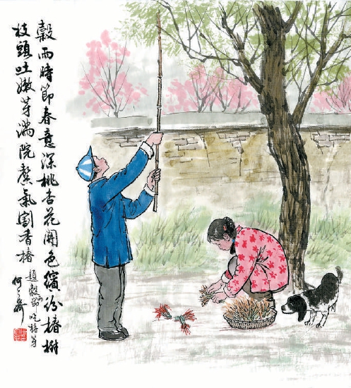 小时候我家院子里就有一棵大香椿树,每到这个节气,树尖的枝杈上就长满了泛紫红色的小芽儿,院子里都能闻到一阵阵的清香,我们这些孩子可盼到能采摘的日子了。可是树太高了,枝头上的根本够不到,又不能像秋天枣熟了一样,用竹竿往下打,只能从叶茎处切割轻摘。这活儿就包在我身上了。我从空铁皮罐头盒上剪下一段弯钩形铁片,把它用麻绳绑在竹竿儿上,举着这做好的工具,颤悠悠地瞄准了爱物,往下一拉竹竿儿,那诱人的香椿芽儿就下来了。一个小芽儿一个小芽儿地向下切割,不一会儿就满头大汗,但照样干劲儿十足,一是为吃,二是觉得好玩儿。终于攒够一小盆了,端去送给厨房里正在做饭的母亲。