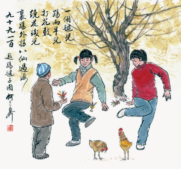 旧时的北京,不论在四合院内,还是在胡同里,或学校的操场上,都可以看到孩子们踢毽儿的身影,和这首响亮的伴奏儿歌。我上小学时,这是课间休息最常见的一种休闲健身游戏。占地面积小,有块空地儿就能玩儿,毽儿都是孩子自己做,我们管这个叫“庖毽儿”。那时住平房,家里都养鸡,用的材料就现成了,在鸡窝、院子里都能捡到鸡毛,实在捡不到就从鸡身上拔几根。听说从活鸡身上拔下的毛做成的毽儿好踢,也不知有什么道理。那时铜钱儿虽已不当货币用了,但很好找到。用一块软皮条或结实的布,中间剪一小洞,把它蒙在两枚铜钱儿上,从背面将两头从小洞和铜钱方孔中拽出,毽托儿就做好了,有的中间插段儿鹅毛管,将五颜六色的鸡毛塞在里面,把两侧的布头裹紧,用小线儿绑结实就行。但大部分都省去插鹅毛管,直接捆好就齐活了。虽说工艺简单,但颜色的搭配,长毛短毛的组合成形状,也能让伙伴们评价一番。公认好看的,也得且显摆呢!记得我做的,很少有人夸,而且踢几次就散了架,再换几根鸡毛,捆紧点儿,就又有的玩儿了。