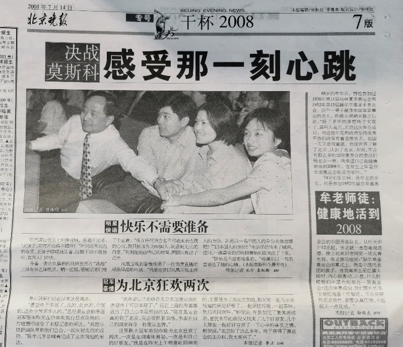 近日,团结出版社隆重推出“纪念珍藏版”《中国式申奥》,也把黄克俭的思绪又带回到20年前那个难忘的不眠之夜。“这是2001年7月14日《北京晚报》为申奥成功推出的专号,上面就有我的照片。”新书分享会现场,他从包里拿出一张略有些泛黄的报纸,向大家展示起来。