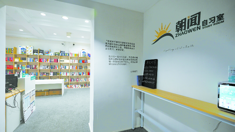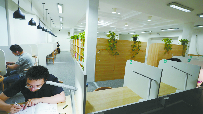 “朝闻自习”刚刚试运营半个月,深受上班族、学生族喜爱。暑假期间,在北京航空航天大学上大二的小窦常常背着电脑来自习。他打开电脑,插上耳机上网课,累了,就翻翻书架上的书。“在家里静不下来,学不进去,到这里就不一样了。”