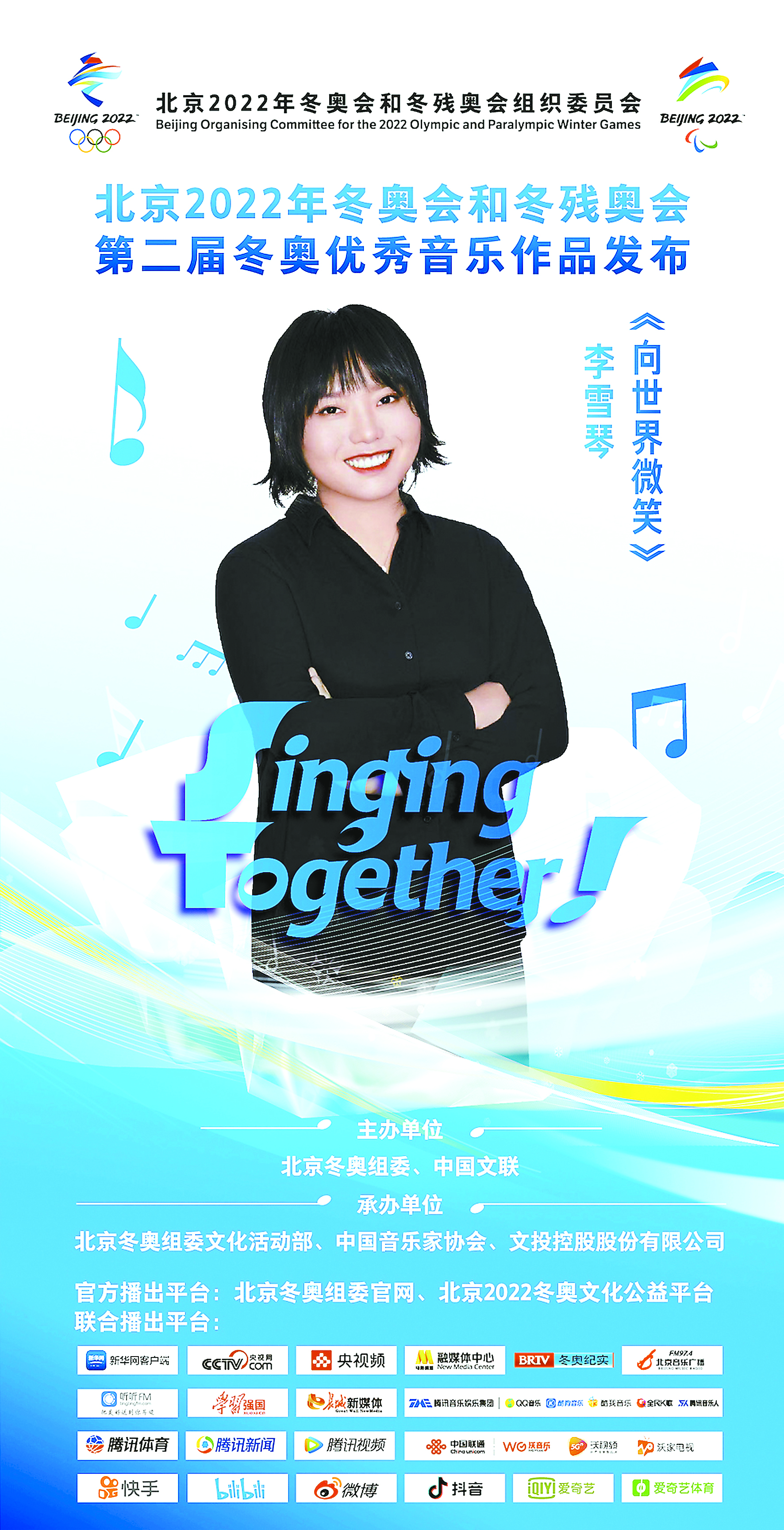 另据了解,随着北京冬奥会日渐临近,第三届冬奥优秀音乐作品征集活动采取了定向委约方式进行。北京冬奥组委与北京音乐广播、中国音乐家协会和电影频道节目中心一同邀请多位著名词曲作者参与创作,并计划从委约征集的作品中评选出包含火炬传递歌曲、颁奖歌曲、冬残奥会主题歌曲等10首优秀歌曲。