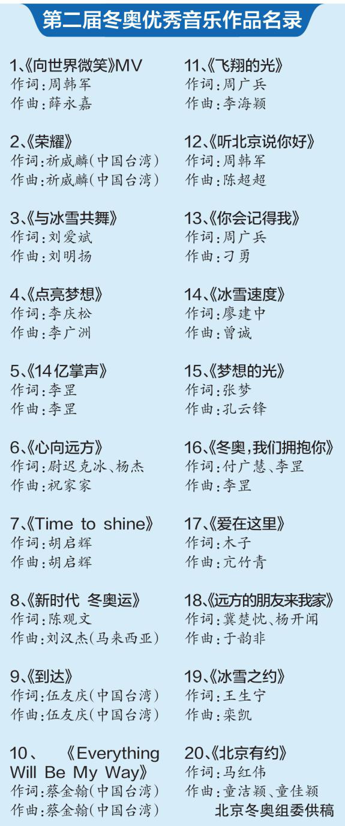 今晚8时发布《荣耀》,词曲作者是来自我国台湾的祈威麟。在第二届冬奥优秀音乐作品中,还有两首的词曲作者也来自台湾,他们是《到达》的词曲作者伍友庆和《Everything Will Be My Way》的词曲作者蔡金翰。