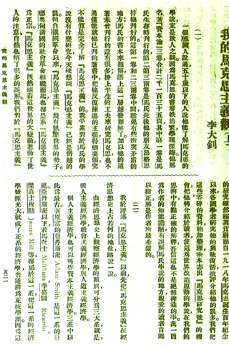 李大钊所作出的重要理论贡献,反映在其主持的《新青年》的“马克思研究号”上发表的《我的马克思主义观》一文中。李大钊开宗明义,首先说明他介绍马克思学说的本意:“‘马克思主义’既然随着这世界的大变动,惹动了世人的注意,自然也招了很多的误解。”为此,“我们把这些零碎的资料,稍加整理,乘本志出‘马克思研究号’的机会,把他转介绍于读者,使这为世界改造原动的学说,在我们的思辨中,有点正确的解释,吾信这也不是绝无裨益的事”。